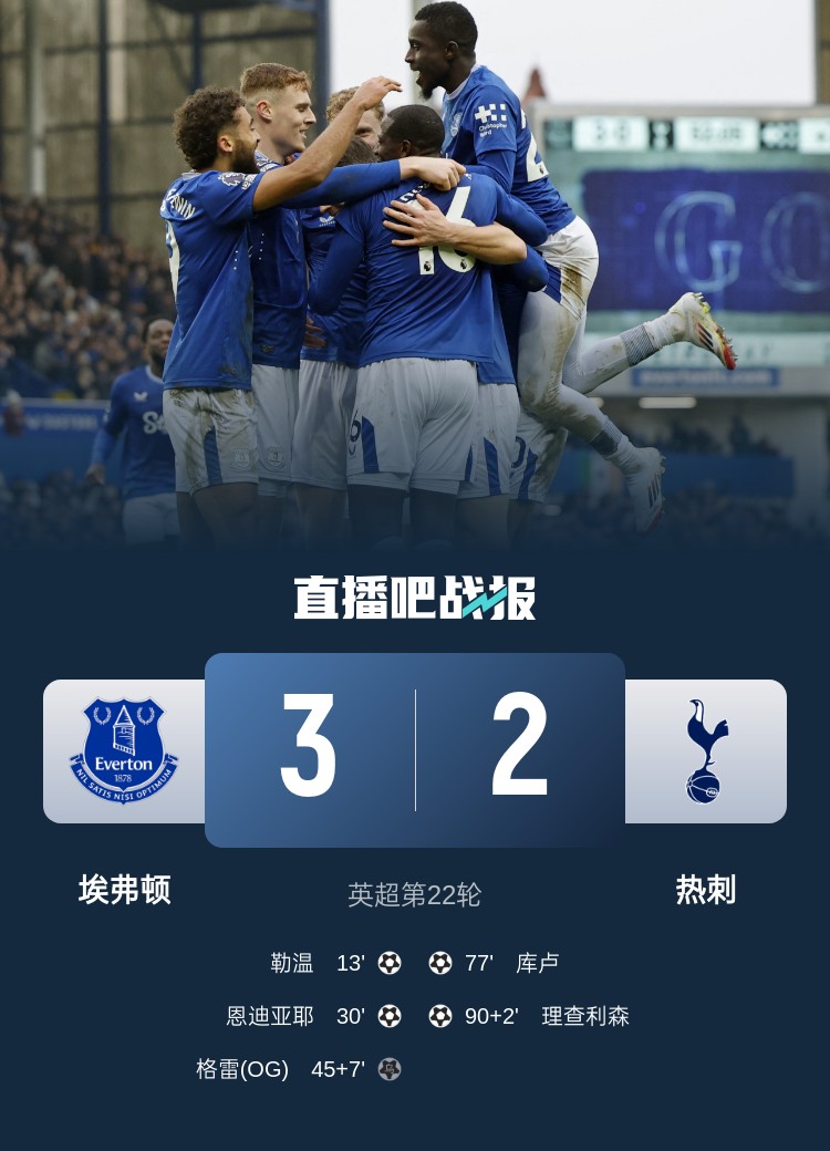 近6輪5負(fù)!熱刺2-3埃弗頓仍倒數(shù)第6 莫耶斯迎回歸首勝勒溫破球荒