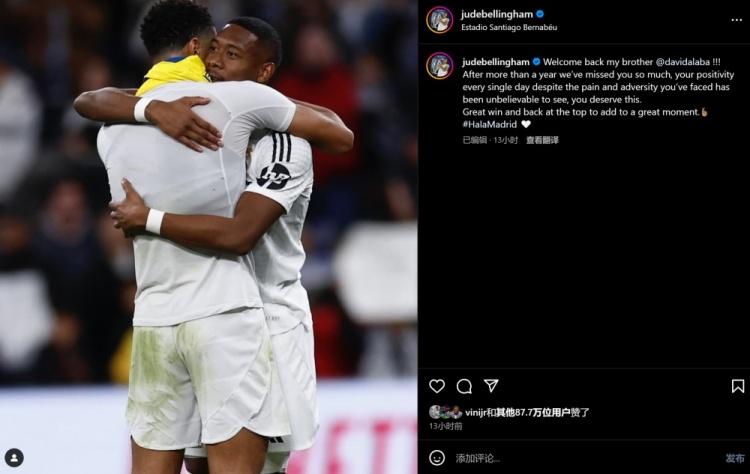 1月20日訊 在皇馬擊敗拉斯帕爾馬斯的比賽中,阿拉巴在第75分鐘替補(bǔ)登場(chǎng),遭遇十字韌帶撕裂重傷后時(shí)隔399天復(fù)出。比賽后,貝林厄姆更新了社媒,向阿拉巴致敬。
