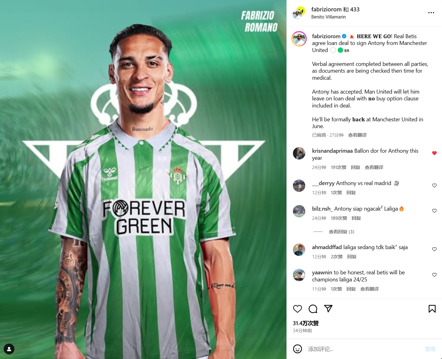 狂歡熱議安東尼去貝蒂斯:今年金球、要踢皇馬了、破梅羅紀(jì)錄