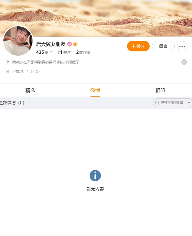 微博賬號(hào)“唐天翼女朋友”、控訴唐天翼在其孕期出軌、涉賭球的用戶,目前已清空微博,微博簽名寫道:“我就這么不配得到真心是嗎 別在舉報(bào)我了”。