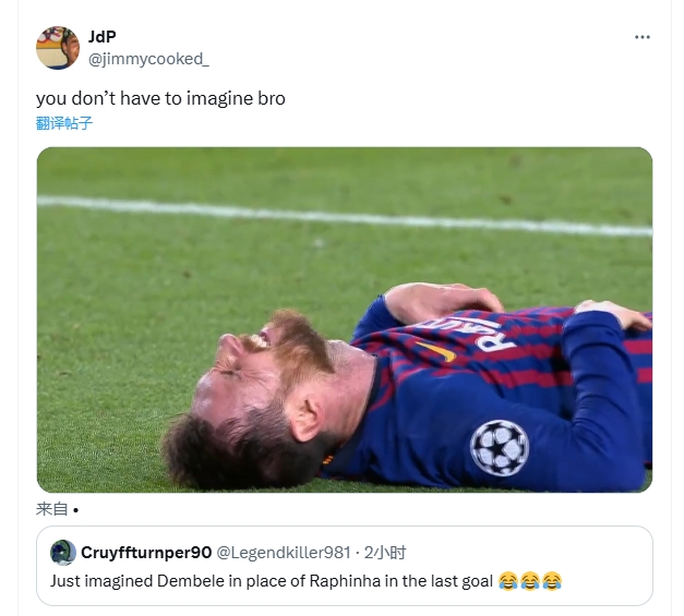 球迷“挖墳”2019年歐冠半決賽首回合巴薩3-0利物浦的比賽,登貝萊最后時刻接梅西傳球的打門又軟又沒角度,被阿利森直接沒收,錯失提前殺死兩回合比賽的機(jī)會。