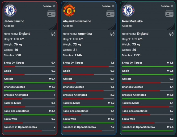 桑喬(曼聯(lián)外租切爾西,16場):場均0.4次射正、打進(jìn)0.2球,助攻0.4次、創(chuàng)造機(jī)會1.9次、嘗試傳中1次,搶斷0.5次、成功過人3.1次,造犯規(guī)0.7次、對方禁區(qū)內(nèi)觸球7次