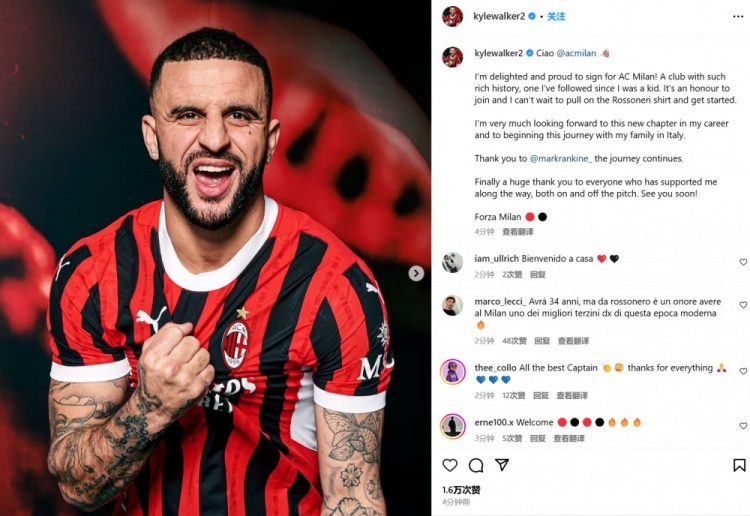 1月25日訊 34歲曼城老將沃克在今日官宣租借加盟米蘭,買斷費(fèi)500萬歐元。
