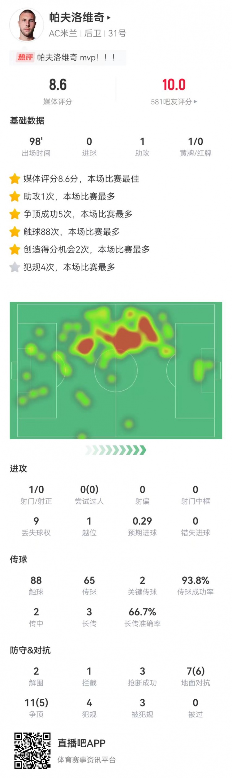 1月26日訊 米蘭在本輪意甲3-2逆轉(zhuǎn)帕爾馬,帕夫洛維奇本場(chǎng)數(shù)據(jù)如下: