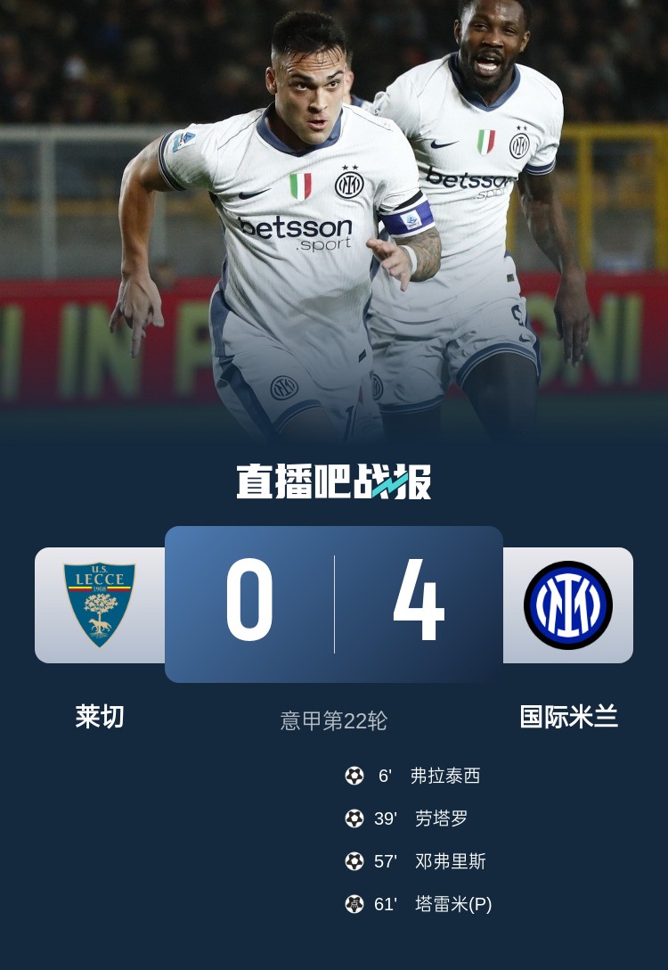 發(fā)布時間:2025年01月27日 18:50點擊:欄目:足球新聞 1月27日訊 國米在本輪意甲4-0大勝萊切,延續(xù)了球隊對陣萊切的統(tǒng)治級戰(zhàn)績。國米可謂是萊切在意甲聯(lián)賽的第一苦主,萊切最近6次與國米交手全敗,并且最近的5次交手全都被國米零封,這5次交手狂丟14球進0球。萊切上一次在國米身上拿分還是在2020年1月19日,當時他們主場1-1戰(zhàn)平國米。 除特別注明外,本站所有內容均為九球直播整理排版,轉載請注明出處:一球難求!萊切面對國米已經(jīng)遭遇6連敗,連續(xù)5場都被零封狂丟14球 本文標簽: 足球 意甲 國際米蘭 萊切