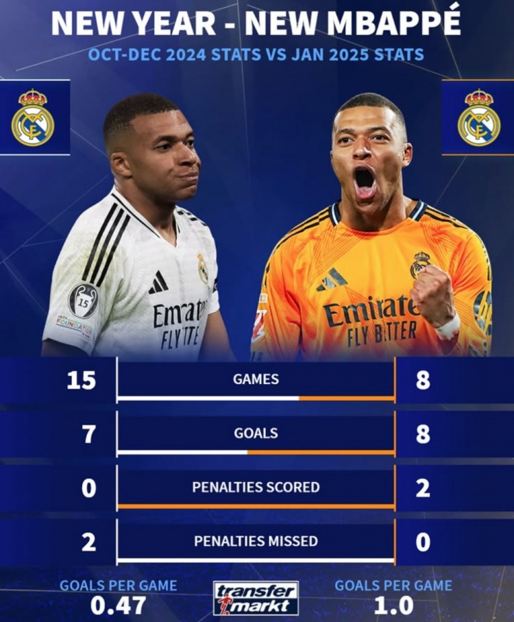 1月28日訊 皇馬在本輪西甲客場3-0完勝巴拉多利德,姆巴佩上演帽子戲法?!兜罗D(zhuǎn)》也對比了姆巴佩今年1月和去年最后3個月在皇馬的關(guān)鍵數(shù)據(jù):