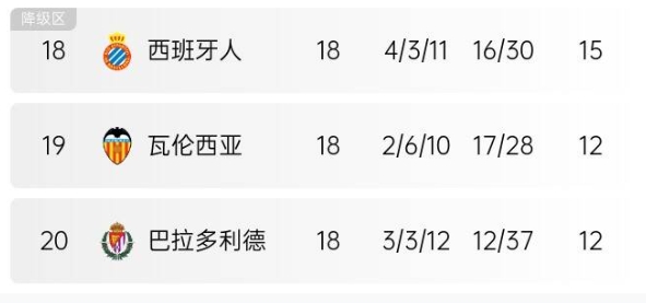 在西甲前18輪,瓦倫西亞僅取得2勝6平10負(fù)的戰(zhàn)績,積12分排名倒數(shù)第二。