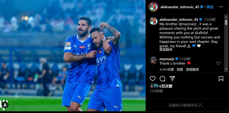 米特洛維奇曬出和內(nèi)馬爾一起慶祝的照片,并寫道:我的兄弟,我很高興能和你并肩作戰(zhàn),也和你在利雅得新月度過了很多美好的時光。祝你在人生的新篇章中幸福美滿。保持堅強,我的朋友!