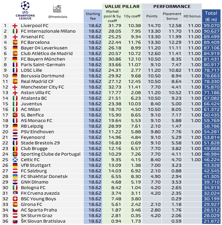 01月30日訊 專業(yè)足球數(shù)據(jù)媒體footballmeetdata計算了本賽季第一階段的歐冠獎金,其中利物浦近1億歐居首,國米第2,槍手第3巴薩第4。