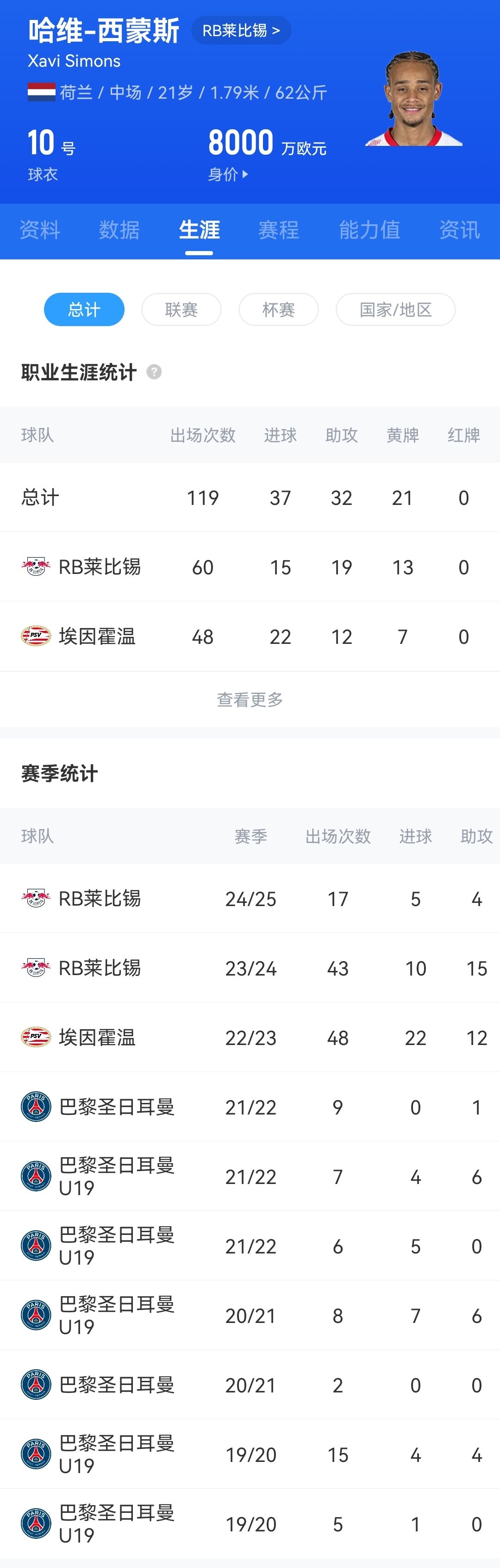 哈維-西蒙斯近兩個(gè)賽季被巴黎外租至萊比錫,本賽季西蒙斯代表萊比錫出戰(zhàn)17場(chǎng),貢獻(xiàn)5球4助攻。