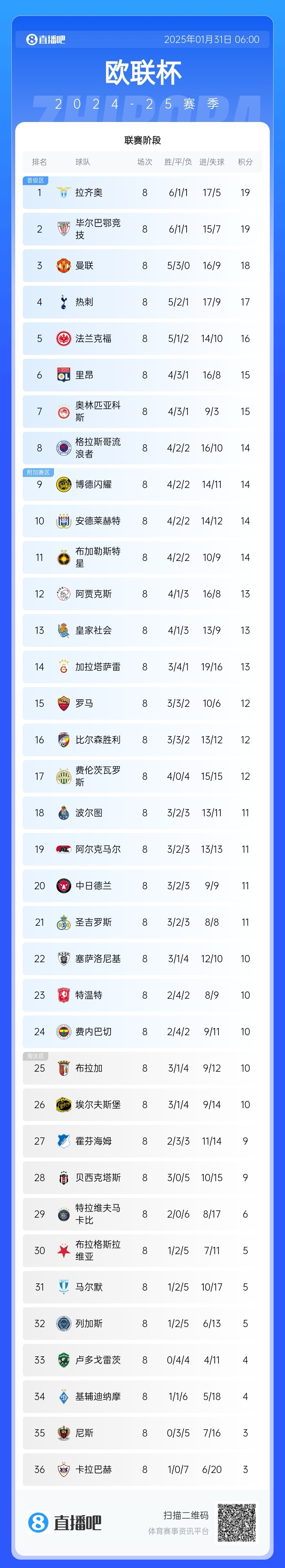 發(fā)布時間:2025年01月31日 11:16點擊:欄目:足球新聞 01月31日訊 歐聯(lián)聯(lián)賽階段的比賽已經(jīng)全部結(jié)束,前八名直通16強的隊伍已確定。歐聯(lián)聯(lián)賽階段前八:拉齊奧、畢爾巴鄂競技、曼聯(lián)、熱刺、法蘭克福、里昂、奧林匹亞科斯、格拉斯哥流浪者。 除特別注明外,本站所有內(nèi)容均為九球直播整理排版,轉(zhuǎn)載請注明出處:歐聯(lián)聯(lián)賽前8:拉齊奧畢巴曼聯(lián)熱刺前4,法蘭克福里昂在列 本文標簽: 足球 歐聯(lián)杯 英超 曼聯(lián) 熱刺 西甲 畢爾巴鄂競技 意甲 拉齊奧 德甲 法蘭克福