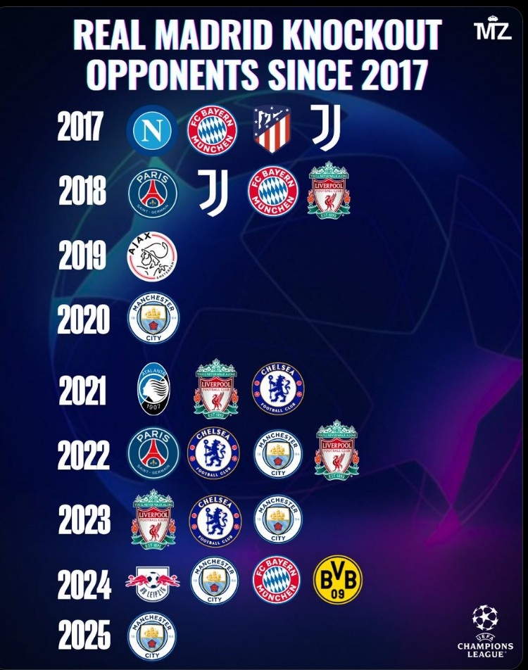 外媒也列出皇馬自2017年以來在歐冠淘汰賽所有對手,除了2019年的阿賈克斯之外均為五大聯(lián)賽球隊,具體如下: