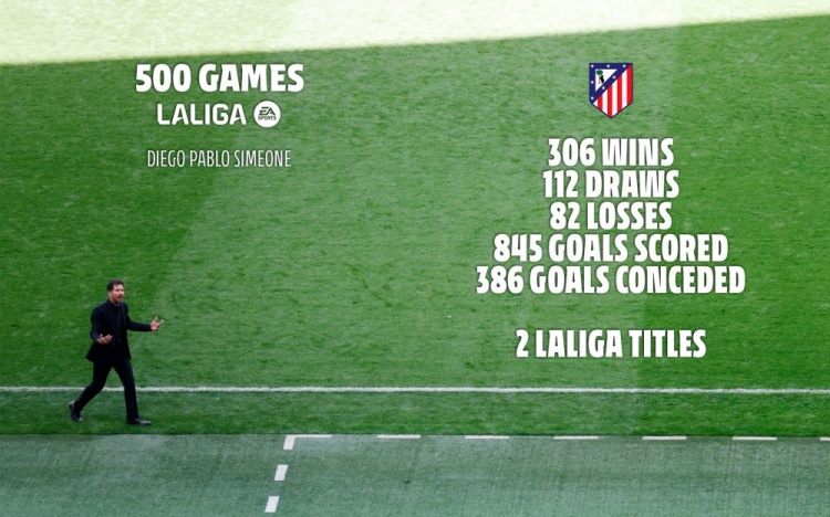 據(jù)馬競(jìng)統(tǒng)計(jì),在這500場(chǎng)比賽中,西蒙尼收獲了306勝112平82負(fù)的出色戰(zhàn)績(jī),一共打進(jìn)845球、丟掉386球。