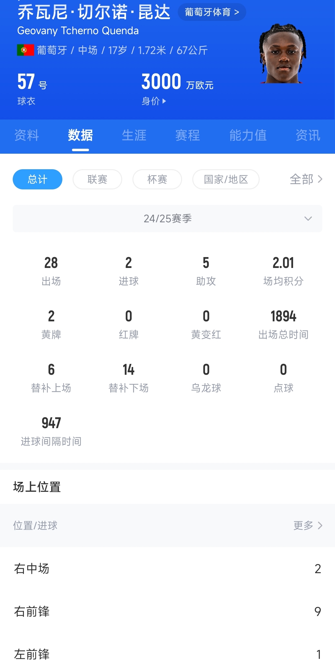 昆達(dá)場(chǎng)上位置主要司職邊翼,左右兩個(gè)邊路的邊鋒和邊翼衛(wèi)均能勝任,本賽季昆達(dá)代表葡萄牙體育出戰(zhàn)28場(chǎng)比賽,貢獻(xiàn)2粒進(jìn)球和5次助攻。