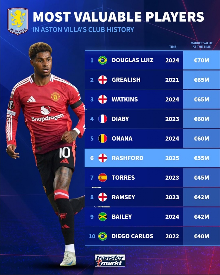2月3日訊 曼聯(lián)前鋒拉什福德租借加盟維拉,德國(guó)轉(zhuǎn)會(huì)市場(chǎng)排出了維拉隊(duì)史球員德轉(zhuǎn)身價(jià)排名,拉什福德以5500萬(wàn)歐排名第6位。