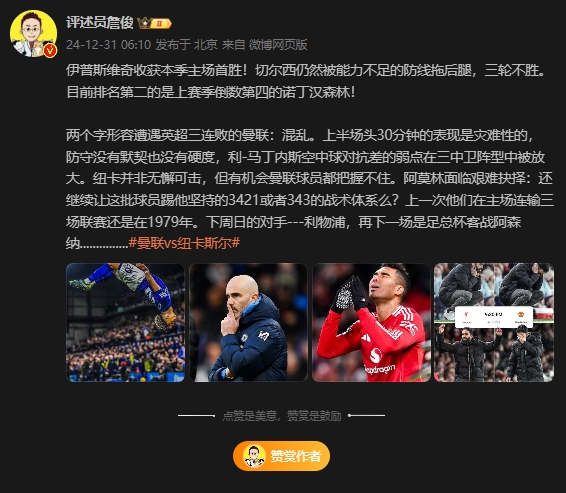 12月31日訊 本輪英超,切爾西0-2不敵伊普斯維奇,曼聯(lián)0-2不敵紐卡斯?fàn)柭?lián),賽后,評(píng)述員詹俊在社媒上對(duì)這兩場(chǎng)比賽做出點(diǎn)評(píng)。