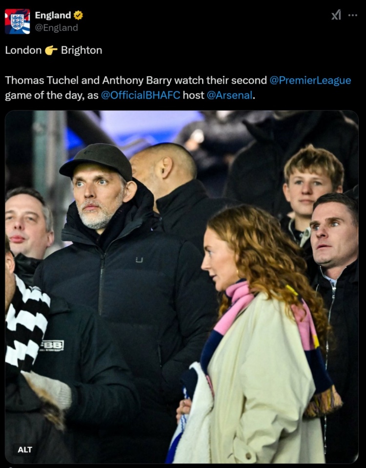1月5日訊 英超第20輪,阿森納客戰(zhàn)布萊頓的比賽正在進(jìn)行。英格蘭代表隊官方確認(rèn),新帥圖赫爾和助教巴里正現(xiàn)場觀戰(zhàn),考察自己的隊員。這也是圖赫爾上任后觀戰(zhàn)的第二場聯(lián)賽。