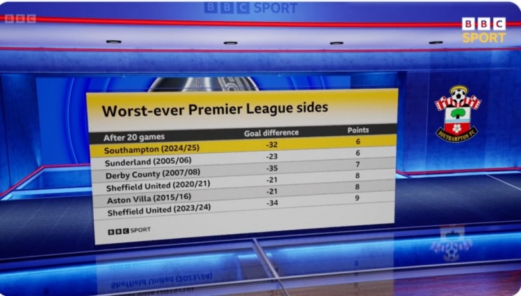 此役過后,南安普頓1勝3平16負積6分,英超歷史同期積分最少。