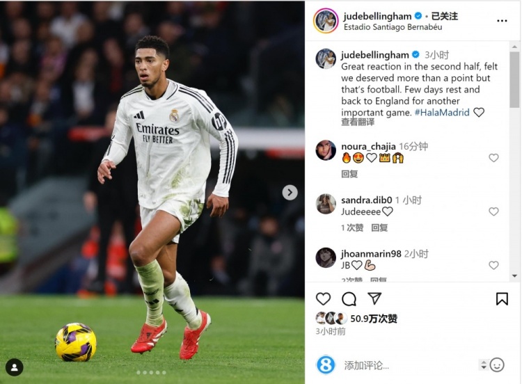 發(fā)布時間:2025年02月09日 11:50點擊:欄目:足球新聞 2月9日訊 西甲第23輪比賽,貝林厄姆踢滿全場,幫助皇馬主場1-1戰(zhàn)平馬競。貝林厄姆曬出自己的比賽照片,配文:“球隊下半場的反應(yīng)很好,我覺得我們理應(yīng)拿到更多的積分,但這就是足球。”“休息幾天,然后回到英格蘭參加另一場重要比賽(歐冠對曼城)?!?/p> 除特別注明外,本站所有內(nèi)容均為九球直播整理排版,轉(zhuǎn)載請注明出處:貝林厄姆社媒:我們理應(yīng)拿到更多積分,將迎來另一場重要比賽 本文標(biāo)簽: 足球 西甲 皇家馬德里 貝林厄姆
