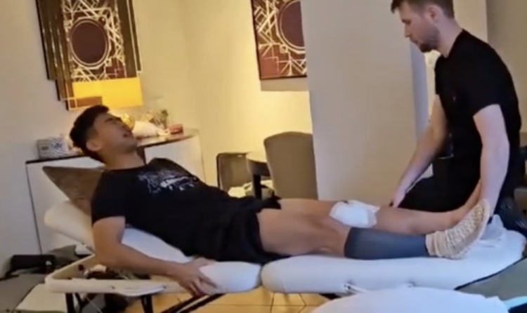 視頻中可以看到,戴偉浚左膝手術(shù)傷口仍用紗布包扎,他在康復(fù)師的協(xié)助之下,緩慢地抬起左腿進行著術(shù)后的康復(fù),而傷口的疼痛也讓他的表情非常痛苦。