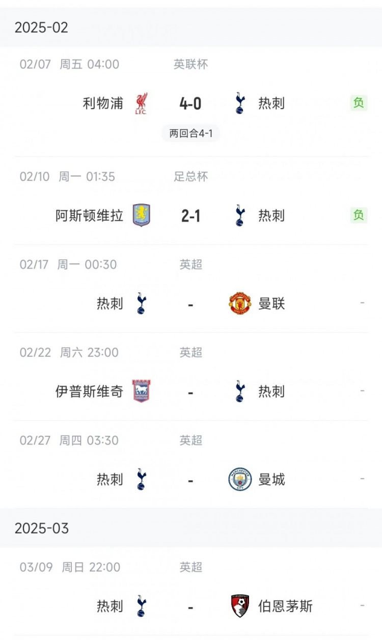 聯(lián)賽方面,熱刺目前8勝3平13負(fù)積27分,排在第14位。接下來(lái)4輪比賽,熱刺將對(duì)陣曼聯(lián)、伊普斯維奇、曼城、伯恩茅斯。