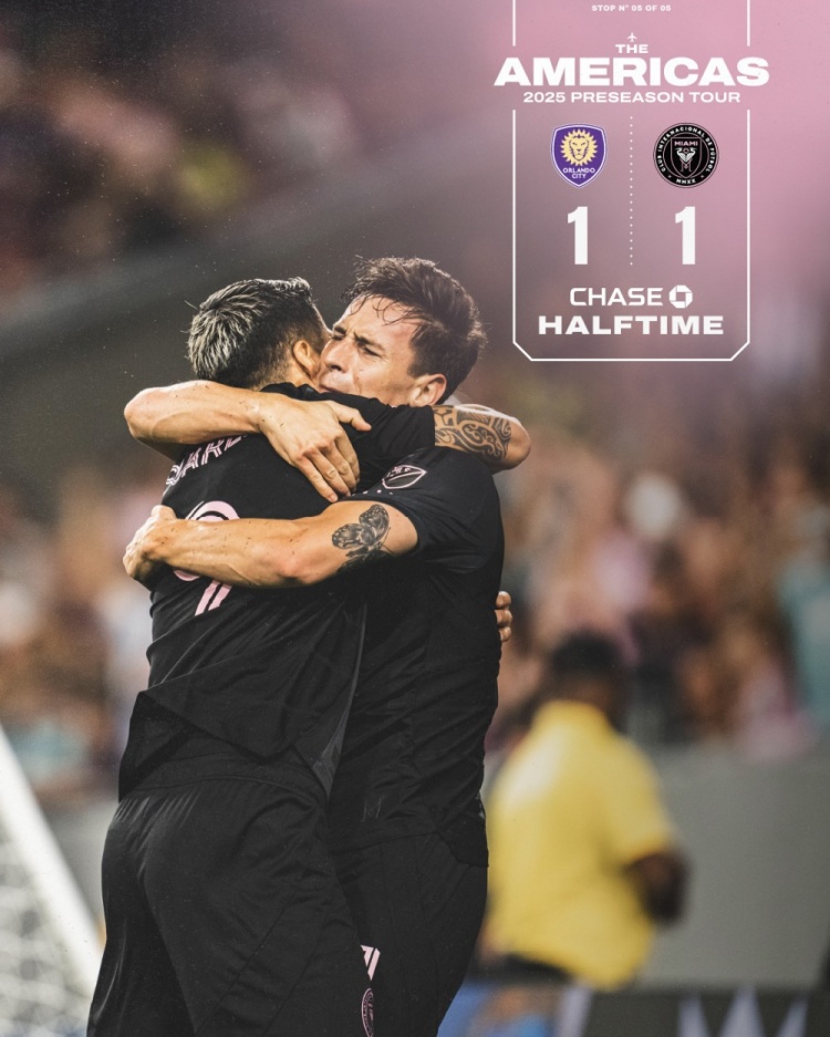 傷停補(bǔ)時(shí)1分鐘。上半場比賽結(jié)束,邁阿密國際1-1奧蘭多城。