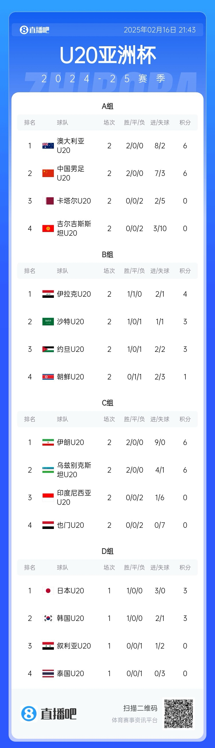發(fā)布時間:2025年02月16日 21:50點擊:欄目:足球新聞 02月16日訊 U20亞洲杯B組第二輪戰(zhàn)罷,各隊排名形勢撲朔迷離,最后一輪將直接對話競爭出線名額。按照賽程,中國男足U20所在A組前二將在淘汰賽首輪與B組前二交叉對決,國青已經鎖定一個出線名額,最后一輪將和澳大利亞爭小組第一。目前B組2輪過后伊拉克積4分排名第一,沙特、約旦均積3分,朝鮮積1分。末輪伊拉克將對約旦,沙特碰朝鮮。 除特別注明外,本站所有內容均為九球直播整理排版,轉載請注明出處:末輪亂斗!U20亞洲杯B組積分榜:伊拉克4分居首,沙特、約旦3分 本文標簽: 足球 國家隊 中超 中國足球