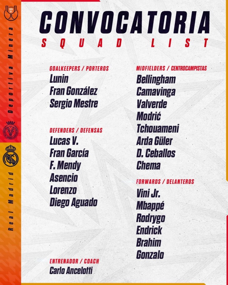 1月5日訊 北京時(shí)間下周二凌晨2:00,皇馬將在國(guó)王杯第3輪中客戰(zhàn)米內(nèi)拉。賽前,皇馬官方公布了將出戰(zhàn)本場(chǎng)比賽的大名單。其中,維尼修斯、姆巴佩、卡馬文加等人在列,呂迪格、庫(kù)爾圖瓦缺席。