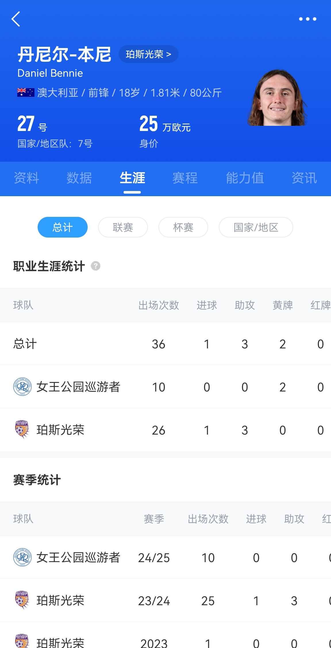 18歲的本尼上賽季在澳超珀斯光榮出場(chǎng)25次,去年夏天以29.7萬(wàn)歐元的轉(zhuǎn)會(huì)費(fèi)加盟英冠女王公園巡游者,本賽季在英冠出場(chǎng)9次。