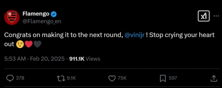 而在皇馬晉級(jí)后,維尼修斯的母隊(duì)弗拉門戈發(fā)文:恭喜維尼修斯晉級(jí)下一輪!收起你的眼淚吧