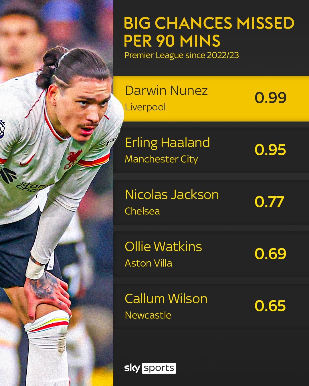 據(jù)天空體育統(tǒng)計(jì),在2022/23賽季努涅斯加盟利物浦之后,他在英超場均錯(cuò)失重大機(jī)會(huì)0.99次在所有球員中排名第一,而在此期間努涅斯在英超的數(shù)據(jù)為86場39球。