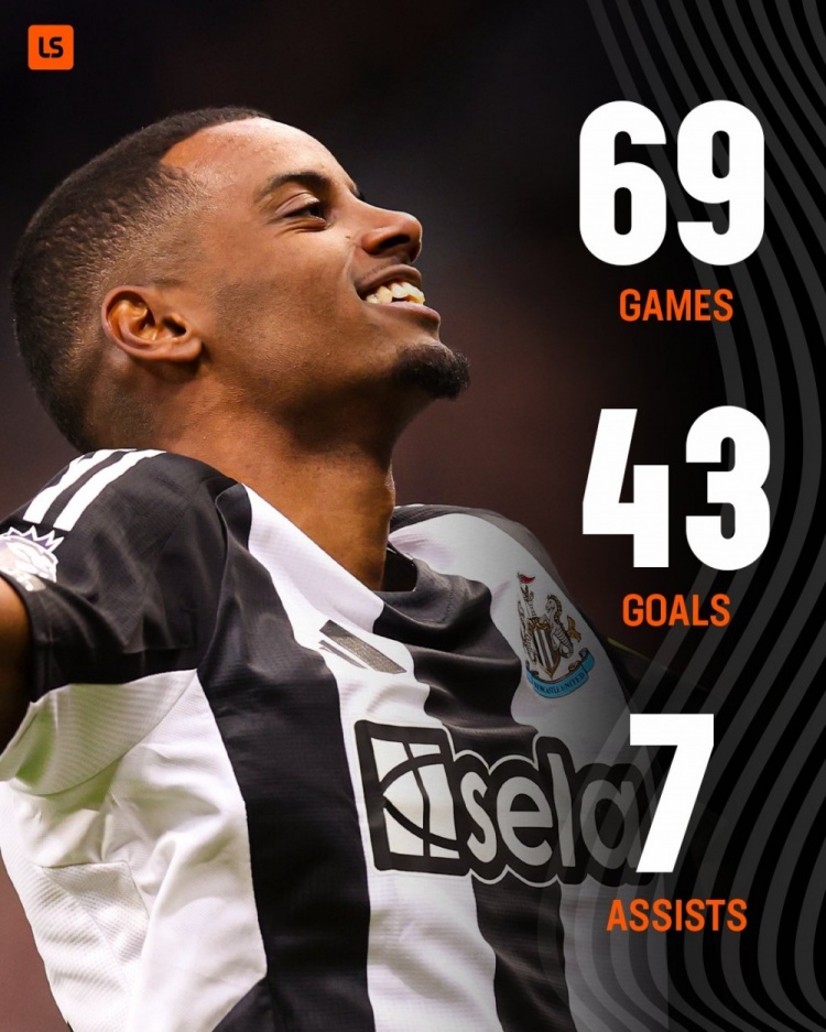 根據(jù)統(tǒng)計,伊薩克英超生涯至今踢了69場比賽,已經(jīng)貢獻了43粒進球和7次助攻,制造了50粒進球。