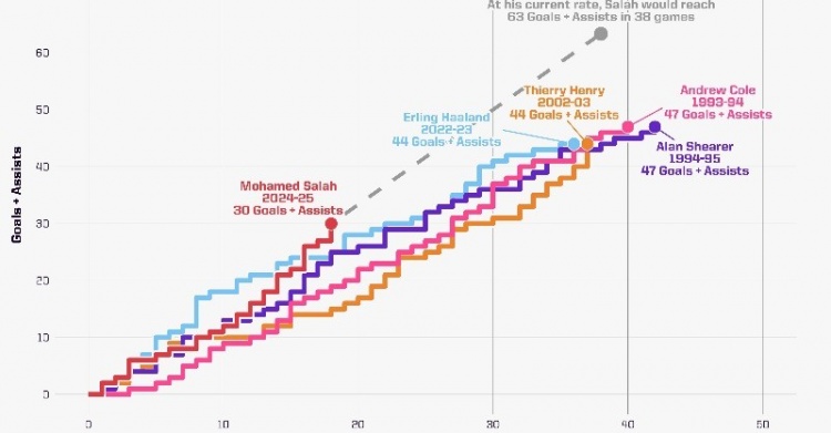 如果保持當前效率,薩拉赫在本賽季38輪完賽后將能夠直接參與63球。