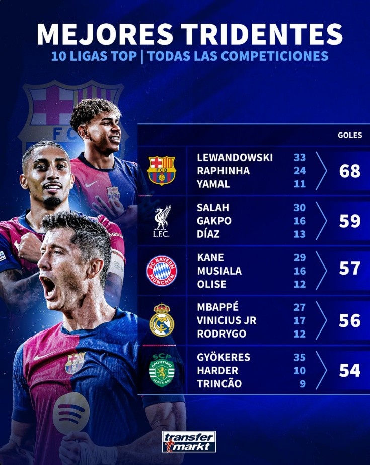 2月27日訊 德轉(zhuǎn)盤點(diǎn)了本賽季歐洲前十聯(lián)賽各項(xiàng)賽事進(jìn)球最多鋒線三叉戟,其中巴薩三將以68球領(lǐng)跑,具體如下:
