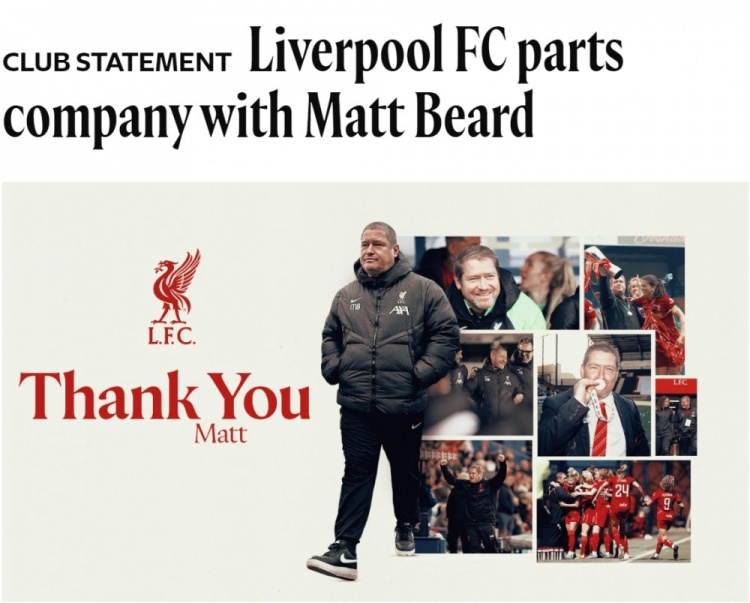 利物浦女足董事會、芬威體育集團總裁邁克-戈登、利物浦首席執(zhí)行官比利-霍根、通訊總監(jiān)蘇珊-布萊克都感謝了比爾德的重要貢獻:“我們和馬特一起經(jīng)歷了許多美妙的時刻,我們對他的重要貢獻表示感謝。我們的首要任務是讓這支球隊回到屬于它的地方,我們在2022年通過贏得晉級WSL共同實現(xiàn)了這一目標。我們需要在這種勢頭的基礎上再接再厲,盡管這是一個艱難的決定,但我們相信這為我們未來在球場上取得成功提供了最好的機會?!?/p>