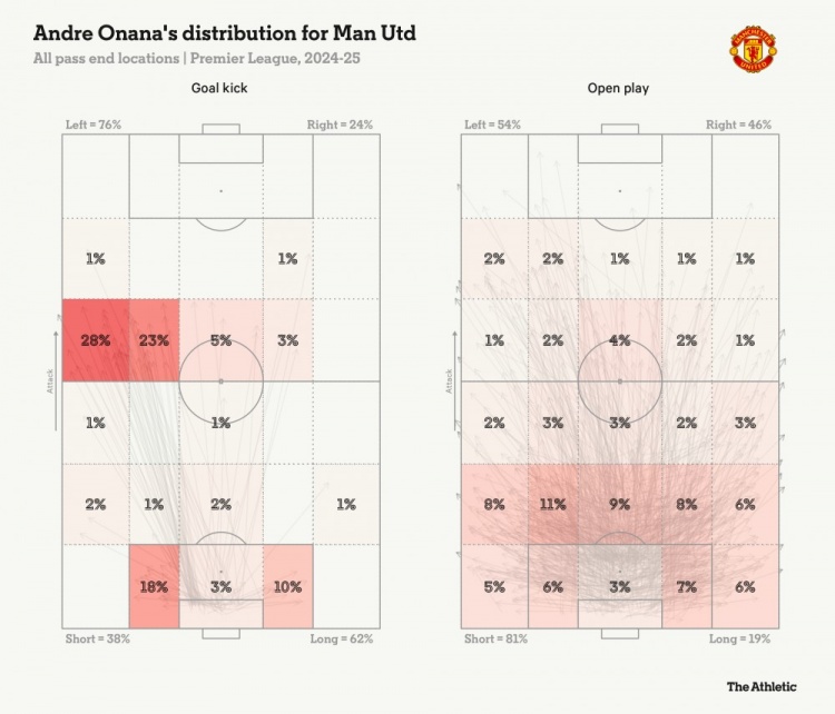 問題似乎在進攻組織的早期階段就已經(jīng)出現(xiàn),從奧納納開始就是如此。曼聯(lián)似乎還沒有找到他最適合的出球方式——盡管現(xiàn)在有點兒趨勢了。本賽季,無論是在滕哈赫,還是在阿莫林麾下,奧納納經(jīng)常會采用長傳球的方式出球,如下圖所示。