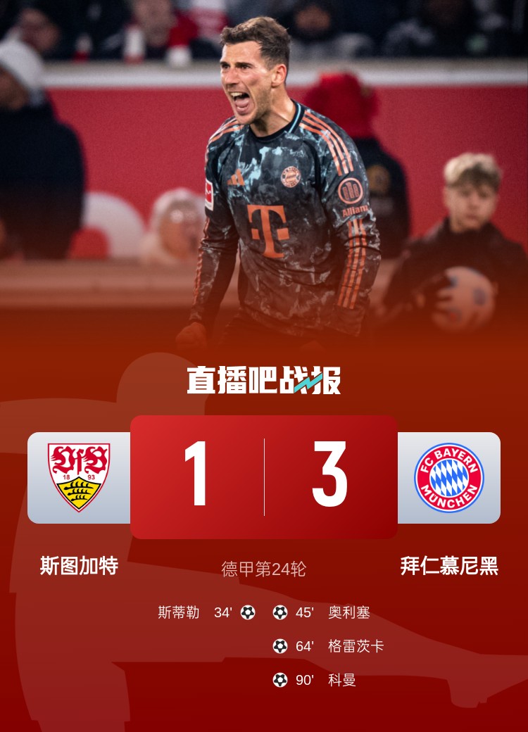 德甲第24輪,拜仁3-1客勝斯圖加特。上半場,斯蒂勒先拔頭籌,奧利塞扳平;下半場,格雷茨卡反超比分,科曼鎖定勝局。