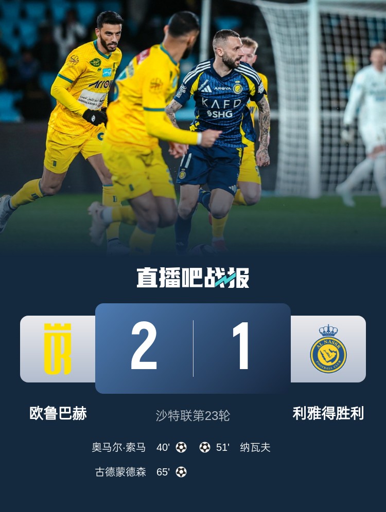 沙特聯(lián)第23輪,利雅得勝利1-2不敵歐魯巴赫。上半場,奧馬爾凌空斬;下半場,納瓦夫替補(bǔ)扳平,古德蒙德森世界波,C羅任意球被撲。