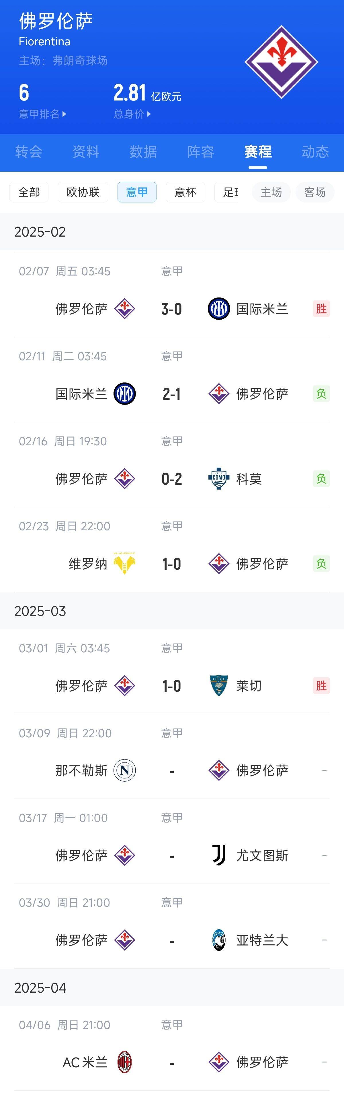 未來(lái)3輪佛羅倫薩將連續(xù)對(duì)陣意甲前4名中的那不勒斯(第2)、尤文圖斯(第4)和亞特蘭大(第3)。