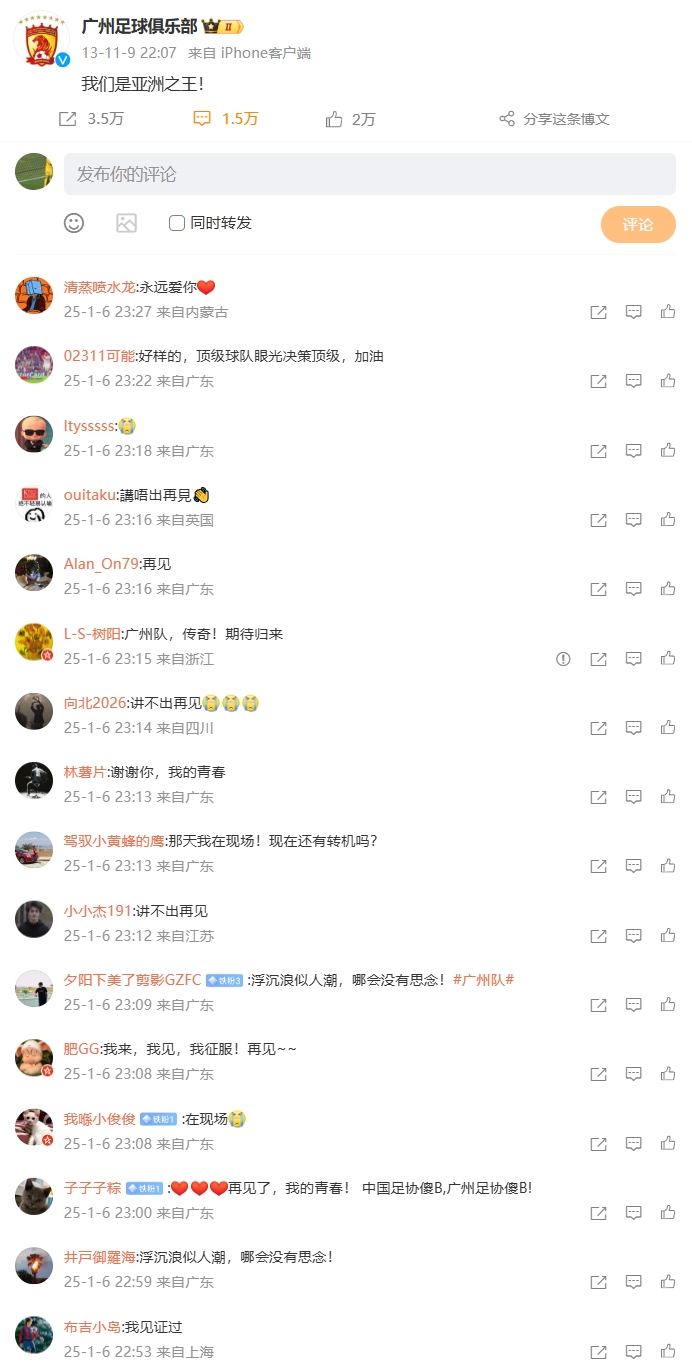 今天,廣州隊(duì)那條“亞洲之王”的微博被球迷刷屏!