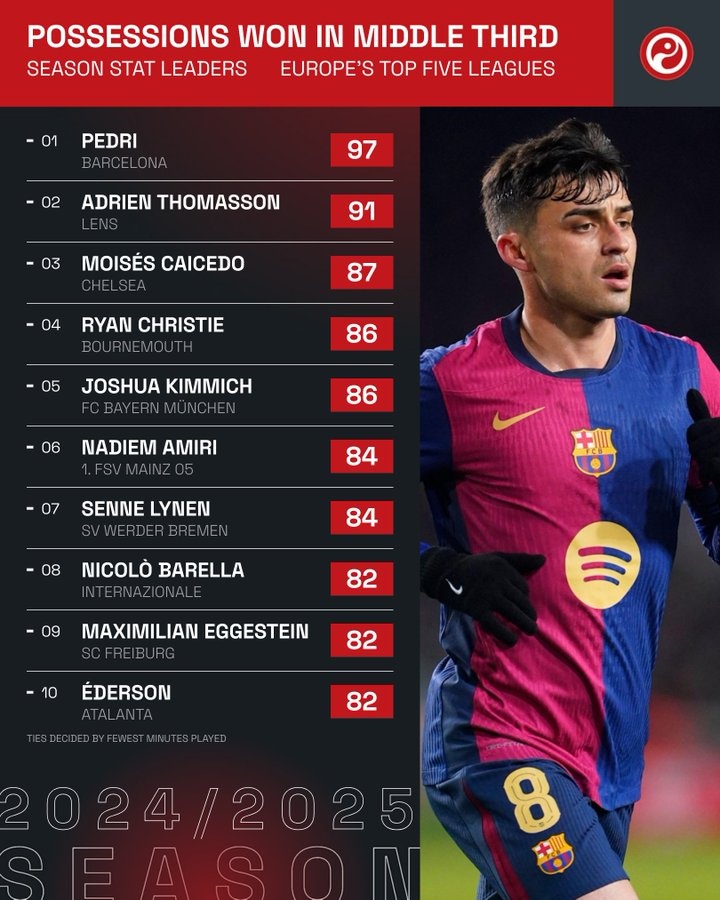 又嫩又狠!佩德里97次在中場(chǎng)搶回球權(quán),冠絕五大聯(lián)賽
