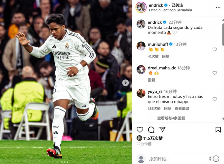 本場比賽恩德里克在最后時(shí)刻替補(bǔ)登場,迎來個(gè)人歐冠淘汰賽首秀。賽后他也在個(gè)人社媒曬出本場照片,配文寫道:“享受比賽的每一個(gè)瞬間!”