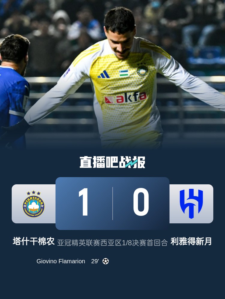 亞冠精英聯(lián)賽西亞區(qū)1/8決賽首回合,利雅得新月首回合0-1塔什干棉農(nóng)。上半場,弗拉馬里昂撞射破門,布萊希傷退;下半場,米林科維奇錯失良機,新月完成一次門線解圍。