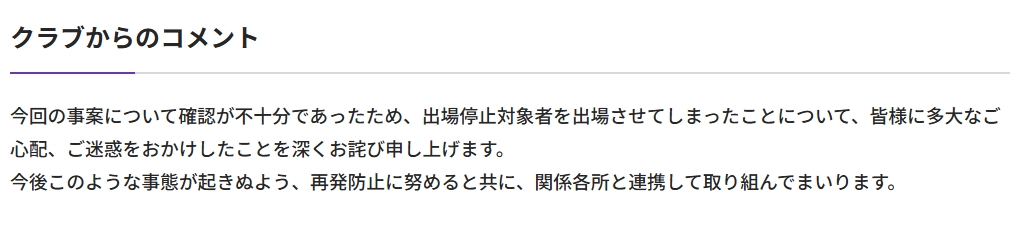 處罰公告發(fā)出后,廣島三箭俱樂部也發(fā)布聲明確認該處罰,并且也回應(yīng)了一則簡短的聲明。