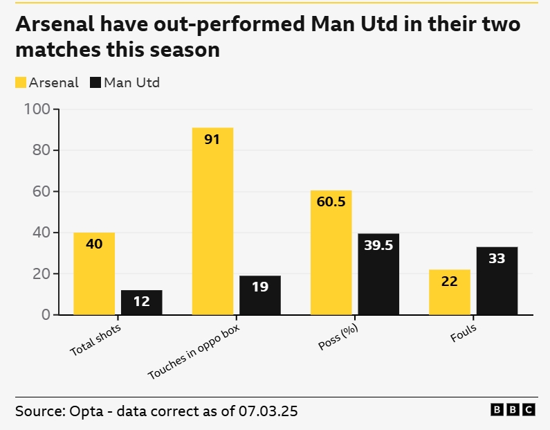 曼聯(lián)vs阿森納今夜再度上演,BBC賽前列出本賽季兩隊(duì)此前交手時(shí)的關(guān)鍵數(shù)據(jù),槍手占據(jù)壓倒性?xún)?yōu)勢(shì)。