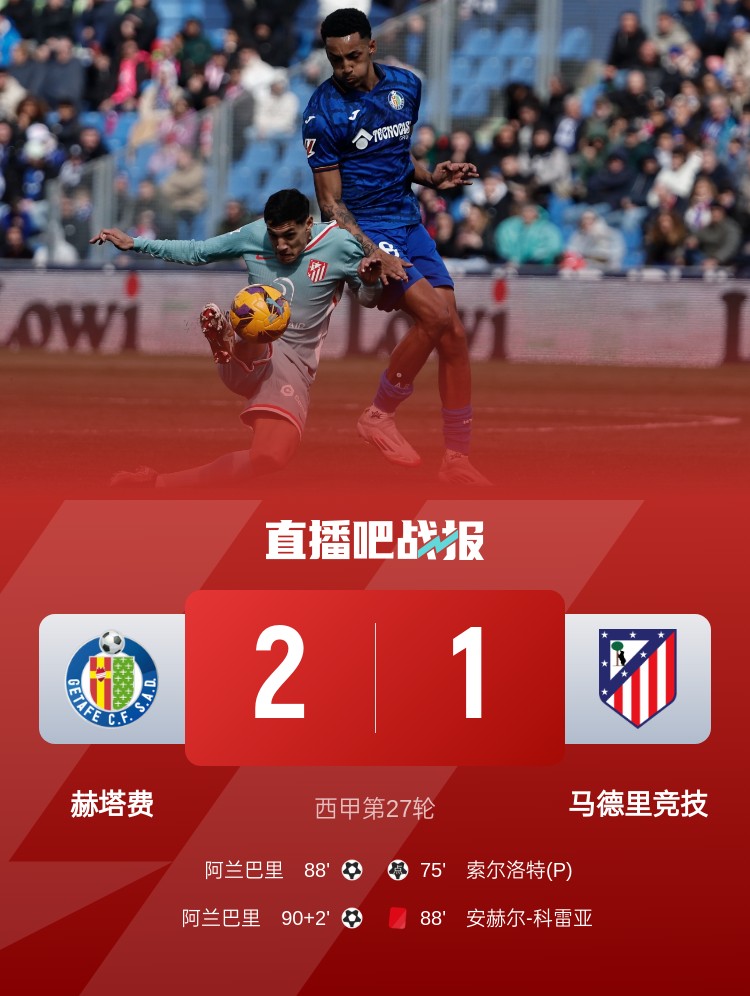 馬競1-2不敵赫塔費(fèi),科雷亞第88分鐘染紅,馬競錯(cuò)失登頂機(jī)會(huì)!