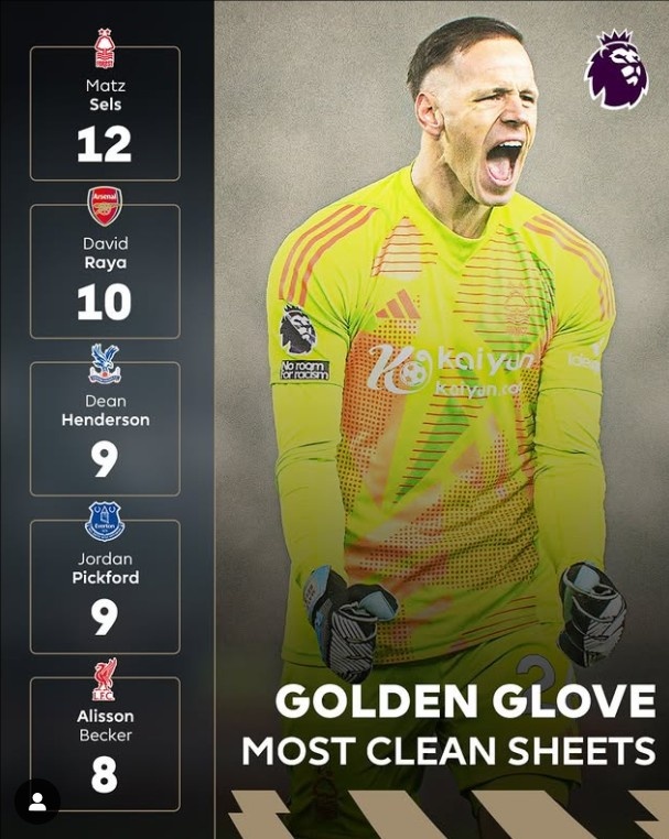 3月10日訊 英超官方曬出最新金手套獎(jiǎng)爭(zhēng)奪情況,上周末零封曼城的塞爾斯以12場(chǎng)居首,領(lǐng)先拉亞的場(chǎng)次擴(kuò)大至2場(chǎng)。