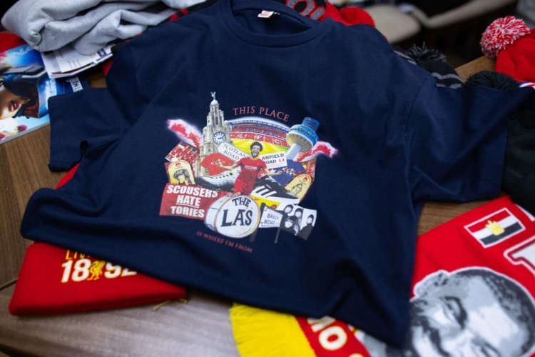 在距離利物浦主場安菲爾德只有5分鐘步行路程的一家商店里,你可以看到當?shù)卣诔鍪垡患?0鎊的T恤,上面印有目前利物浦這座城市的標志:樂隊披頭士和The La's、地標性建筑皇家利物大廈和利物浦電臺城塔,以及薩拉赫。