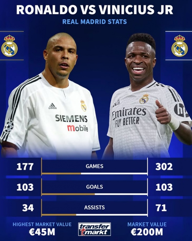 羅納爾多為皇馬出戰(zhàn)177場,貢獻(xiàn)103球34助攻,巔峰德轉(zhuǎn)身價(jià)4500萬歐。維尼修斯則在302場為皇馬貢獻(xiàn)103球71助攻,巔峰德轉(zhuǎn)身價(jià)2億歐。