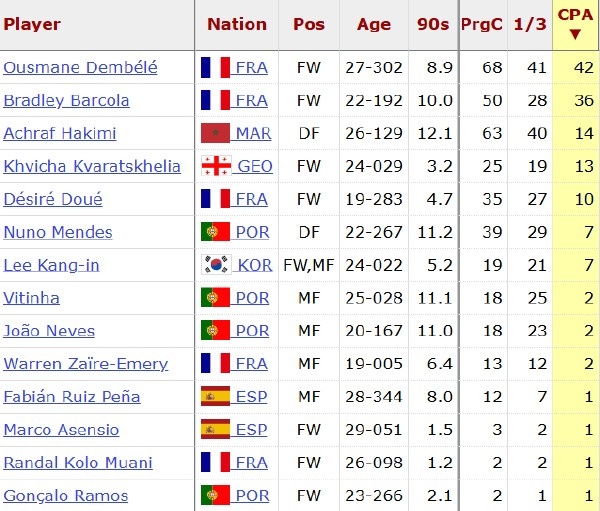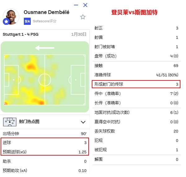 從統(tǒng)計數(shù)據(jù)可以看到,本賽季登貝萊在法甲聯(lián)賽預(yù)期進球是14.2個,但他實際進球高達20個,是隊內(nèi)射門效率最高的球員。